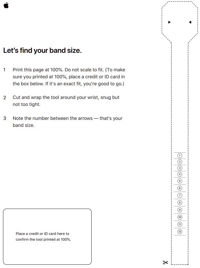 애플이 올려놓은 파일을 인쇄해 측정 도구를 오려 손목에 감아 사이즈를 재면 된다.