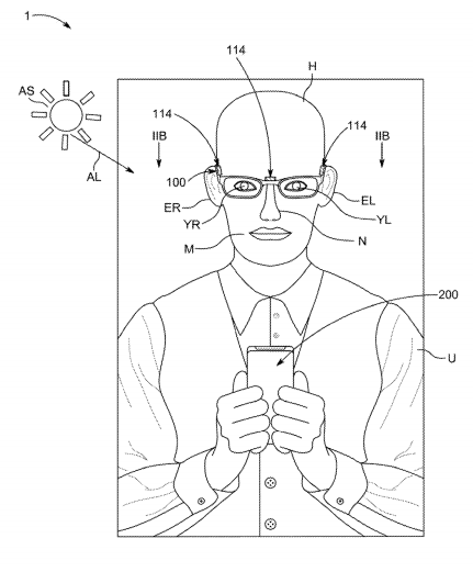 특허에서는 애플 글라스를 얼굴에 착용하면 사람이 움직임을 추적하는 기술을 소개했다.