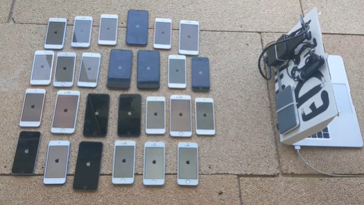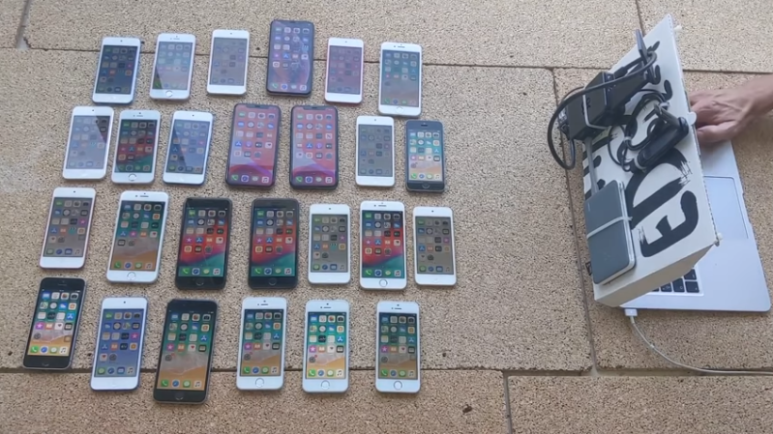 영상에는 해킹이 시작되자마자 가까운 거리에 있는 아이폰 26대가